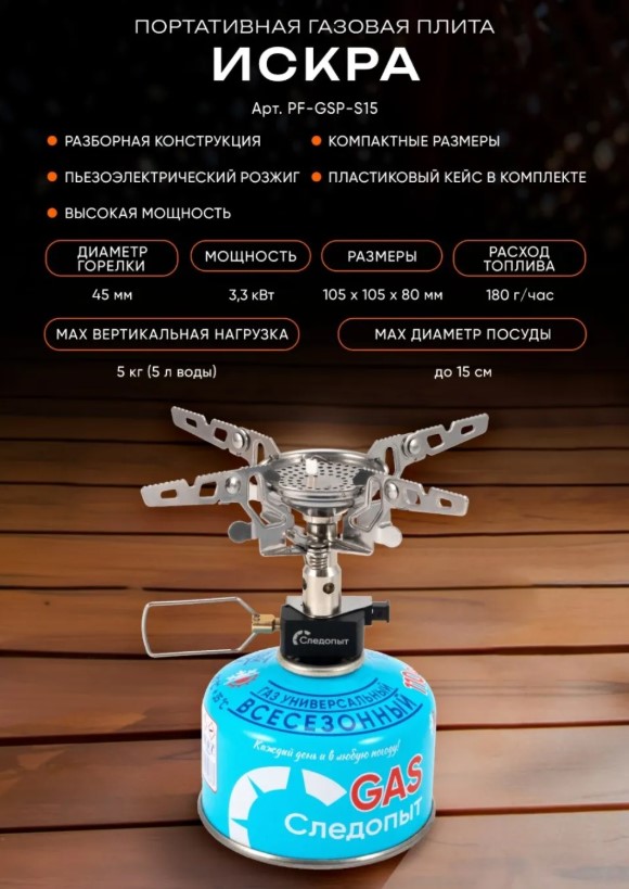 Мощная 3.3 Квт, портативная газовая плита Следопыт - Искра оборудована системой пьезоэлектрического розжига. Идеально подойдет для путешественников, отдающих предпочтение пешим походам по пересеченной местности, а также для горного туризма.