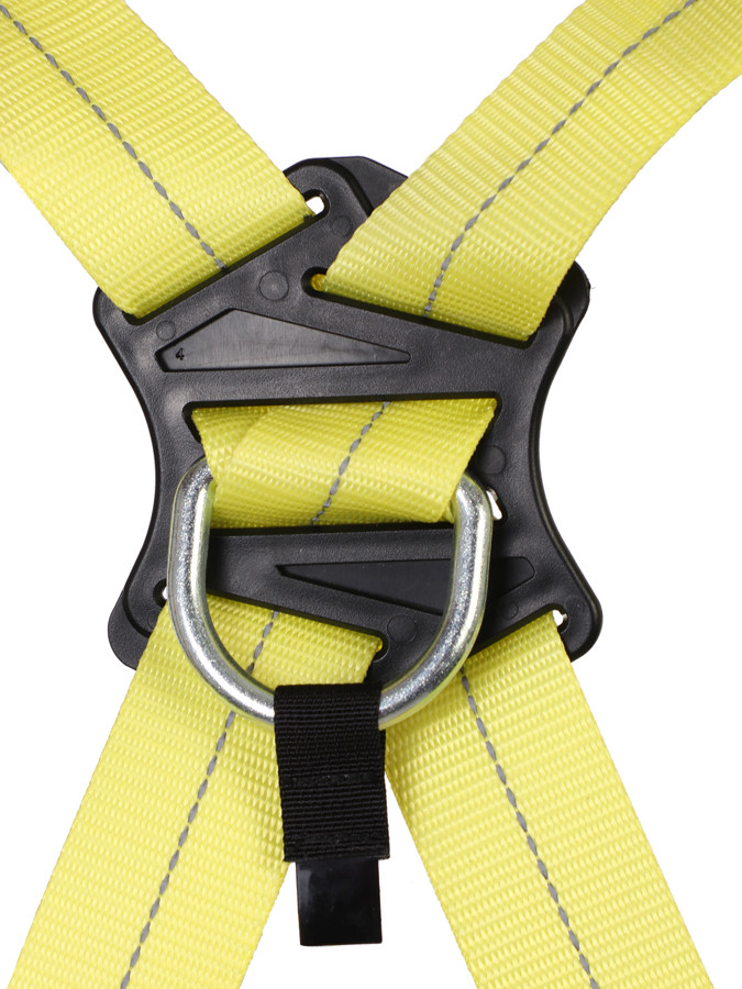 Страховочная точка крепления расположена на спине. Ее можно передвигать по вертикали на Х-образных плечевых лямках для корректировки правильного положения под рост пользователя.