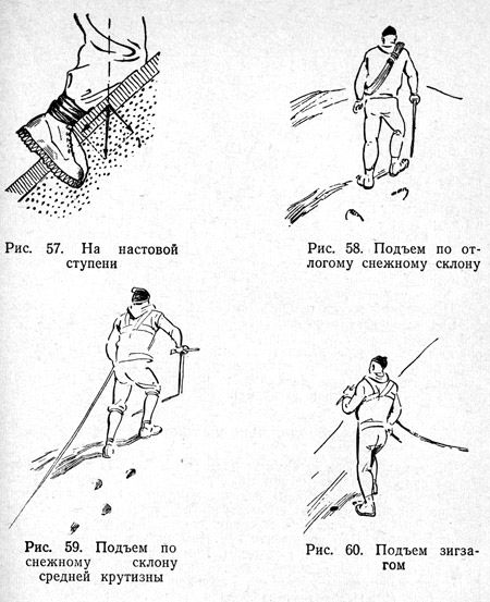 При движении по снегу, в отличие от скал, применяется принцип «двух точек опоры». Этот принцип действителен даже на крутых склонах, когда передвижение совершается способом «в три такта». Только на крутом склоне, покрытом глубоким, рыхлым снегом, где для обеспечения безопасности глубоко в снег запускаются обе руки, соблюдается правило «трех точек опоры». При подъемах и спусках по снежным маршрутам большую нагрузку испытывают мышцы ног. В известной мере из-за сравнительно более быстрого набора высоты, а главным образом, из-за тяжелой работы по изготовлению ступеней, интенсивнее, чем на скальных или ледовых маршрутах, работают сердце и легкие. Последнее особенно важно иметь в виду при проведении тренировок и физической подготовке участников высотных восхождений, в которых преобладают снежные маршруты.